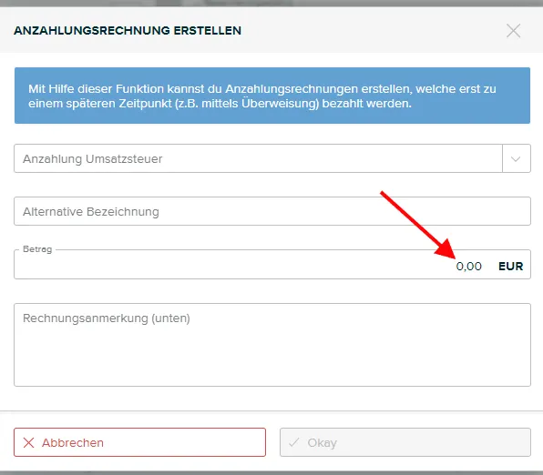 anzahlungsrechnung erstellen, wenn die zahlung zu einem späteren zeitpunkt erfolgt eine firma oder ein reisebüro benötigt vorab eine anzahlungsrechnung um den gefordeten anzahlungsbetrag (z b mittels überweisung) bezahlen zu können achtung! wenn bereits eine zahlung eingegangen ist, muss die anzahlung anders verbucht werden siehe auch docid\ k0xqevnksrml4qlcyq3ok klicken sie rechts unten auf den button "plus" und anzahlungsrechnung erstellen wählen sie die richtige umsatzsteuer und geben sie den gewünschten betrag ein bei bedarf befüllen sie noch die weiteren felder wenn sie nun auf "okay" klicken wird eine anzahlungsrechnung erstellt sobald die zahlung eingeht, muss diese auf den folio der anzahlungsrechnung hinzugefügt werden wie füge ich der anzahlungsrechnung eine zahlung hinzu? wählen sie das folio mit der richtigen rechnungsnummer aus und klicken sie rechts unten auf zahlung hinzufügen fügen sie nun ihre zahlung hinzu und schließen sie den zahlungsvorgang ab